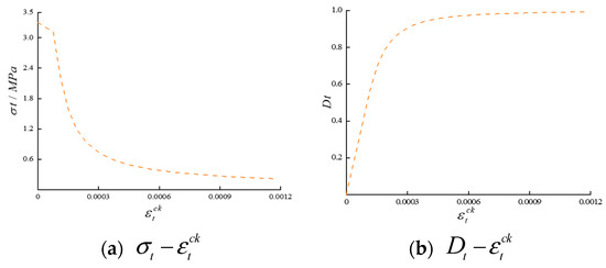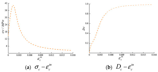 To simulate damage in a concrete arch dam, the CDP model was employed as the constitutive model for the dam body. The CDP model was constructed by integrating plastic mechanics with damage mechanics and has been incorporated into the computational analysis framework of the software ABAQUS [49,50]. This model utilizes the yield criteria from plastic mechanics to determine whether concrete has entered a state of damage. If the material is in a damaged state, the flow rule is applied to calculate the post damage inelastic strain. Subsequently, the stiffness degradation of the material after damage is calculated based on the damage evolution curve. By establishing a relationship between inelastic strain and the damage factor, the model facilitates the simulation of various degrees of structural damage. The parameters of the CDP model include the expansion angle, eccentricity ratio, and viscosity parameter, with values of 30°, 0.1, and 0.0005, respectively. A uniform failure pattern in all directions for the elements was assumed by this model, contributing to a comprehensive representation of damage in the simulation. The damage state can be intuitively observed through the obtained tensile damage factor and compressive damage factor in the CDP model. Figure 3 and Figure 4 show the relationship curves of the CDP constituent model.