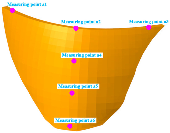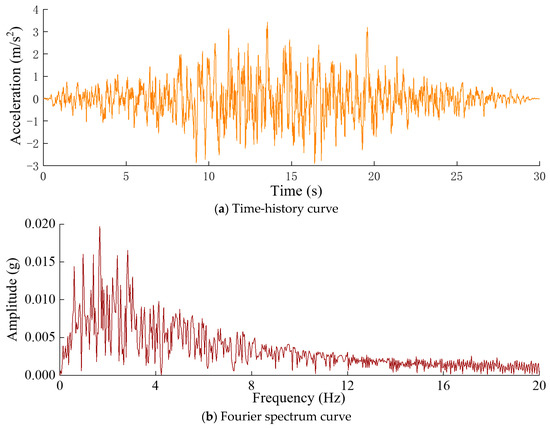 Seismic loading was applied to excite the low-order frequencies of the arch dam. The designed dynamic load exhibited an acceleration peak value of 0.35 g and a duration of 30.0 s and was applied along the direction of the river. The time-history curve and Fourier spectrum curve of the horizontal seismic input acceleration are illustrated in Figure 5. Structural calculations were performed using the large-scale finite element software ABAQUS, which incorporates a compiled subroutine for the additional mass method to account for the interaction between the water and the dam. The data collection duration was 30 s, and the measuring points are shown in Figure 6. Table 1 provides the elevations of the measuring points, and a sampling frequency of 100 Hz was used.