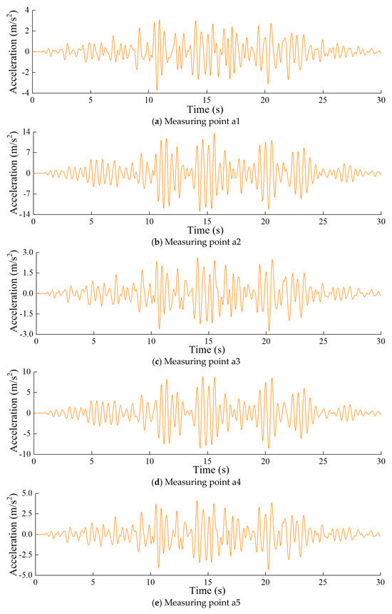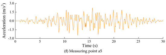 As depicted in Figure 9, there was no damage in the concrete arch dam before t = 8.84 s, and the structure remained time-invariant during this phase. The subspace identification method was employed to identify the time-invariant modal parameters of the structure during this phase. Considering the low frequencies and dense modes of the concrete arch dam, the measured dynamic response from t = 0–6.0 s was selected as the sample for computational analysis.