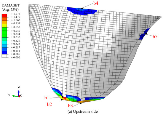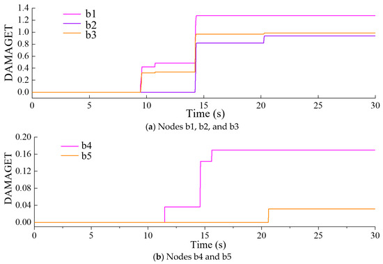 As shown in Figure 9b, the position of node b4 began to show damage during the time period t = 11.47–11.49 s, and the damage in this position developed in the periods of t = 14.59–14.63 s and t = 15.6–15.62 s. In addition, the position of node b5 began to show damage only during the time period t = 20.6–20.62 s. Overall, the damage observed at the upper arch crown and upper right dam shoulder positions is relatively minor. The damage at the dam heel position was greater and more pronounced.