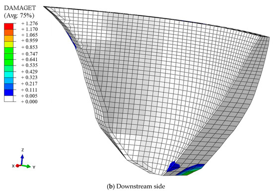 Varying degrees of tensile damage were observed in the dam heel, upper arch crown, and upper right dam shoulder of the arch dam, with the most severe stretching damage being experienced at the dam heel position, where a maximum damage factor DAMAGET of 1.276 is reached, while the damage to other parts was relatively minor [51]. These damaged locations also appeared in multiple finite element simulations and shaking table model tests of arch dams [10,11,52], confirming the validity of the numerical simulation results presented in this study.