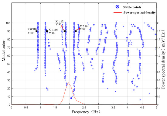 Due to a sampling frequency of 100 Hz, the system order was assumed to range from 2 to 100, with the frequency tolerance, damping ratio tolerance, and mode shape tolerance set at 1%, 5%, and 2%, respectively. The acceleration responses at measuring points 2, 4, and 5 were analyzed. The stability diagram in Figure 10 includes stable points of the model order and the power spectral density curves of the structural response. The horizontal axis represents the frequency, the left vertical axis indicates the model order, and the right vertical axis shows the power spectral density of the output response. Setting the number of stable points to 20, a mode is considered to be stable when the number of stable points is greater than 20, and the corresponding frequency is considered an effective structural frequency identification value. As observed in Figure 10, four orders of frequencies of the structural system were effectively identified. When the model order was greater than 90, the identification values of the various order frequencies were relatively close. When the model order was 90, the frequencies for the first four modes were 0.910, 1.166, 1.871, and 2.161 Hz, respectively.