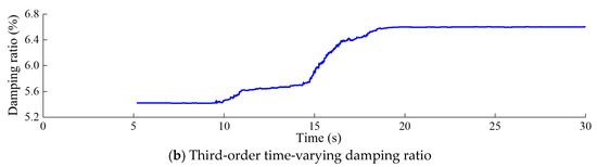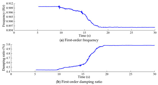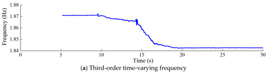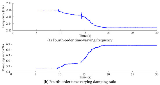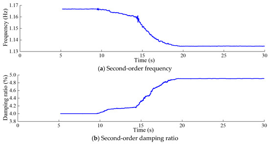 In addition, the lower limit of the forgetting factor was set to 0.95, the weighting factor λ was set to 0.1, and the fixed time interval was set to 0.1 s. Since was set to 520, requiring a dynamic response sequence length of 5.20 s, the analysis period for time-varying parameters ranged from 5.2 s to 25.0 s.