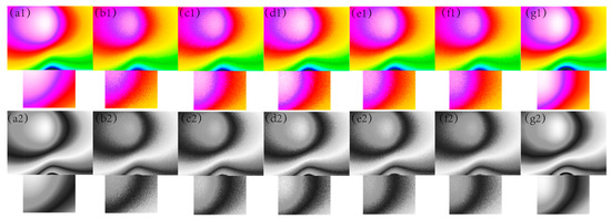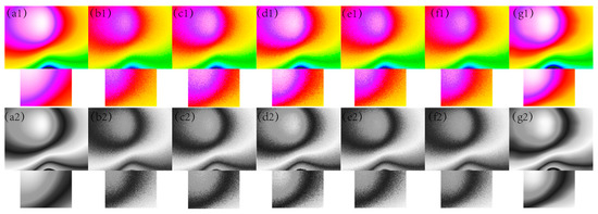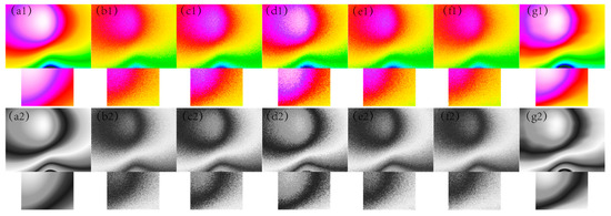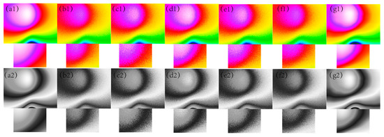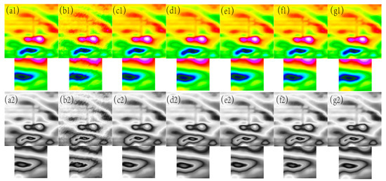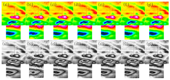 The filtering effect of the measured data of each algorithm when the variance of the Gaussian noise is 0.05, (a1) represents the original magnetic anomaly benchmark image, (b1) the added noise magnetic anomaly benchmark image, (c1) the Gaussian filter denoising effect image, (d1) the mean filtering effect image, (e1) the soft-thresholding wavelet filtering effect image, (f1) the hard-thresholding wavelet filtering effect image, (g1) the filtering effect image of this paper’s algorithm, respectively, and (a2), (b2), (c2), (d2), (e2), (f2) and (g2) are the corresponding grayscale images.