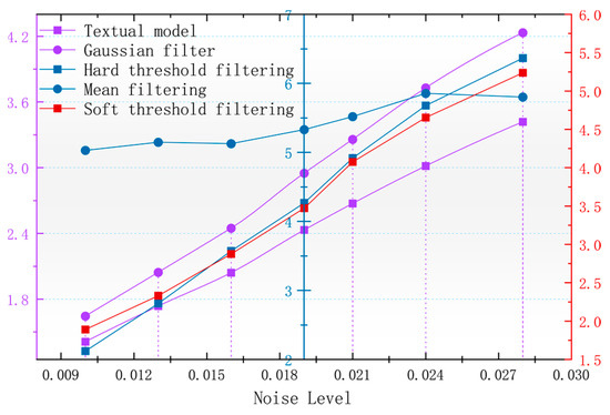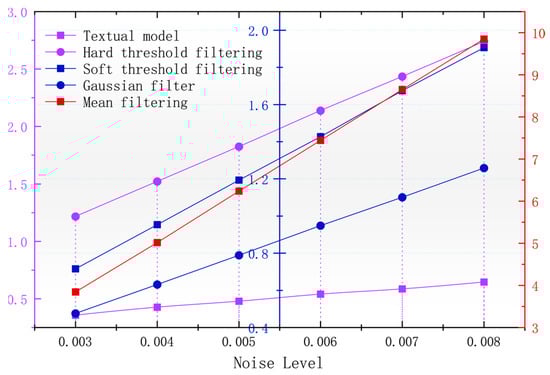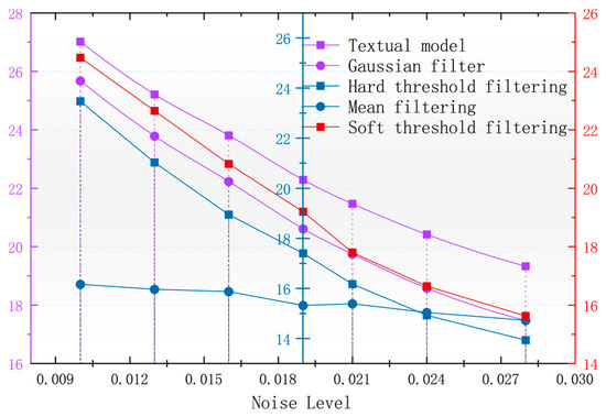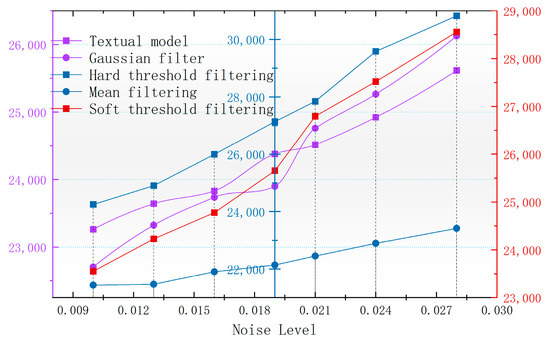Similarly, in order to evaluate the accuracy level of each algorithm in maintaining the original measured data, the size of the root mean square error of the denoising results of different algorithms can be seen in Figure 15. The algorithm of this paper has the smallest root mean square error, and with the increase in the noise, the root mean square error rate of change is smaller, and its performance is better for the robustness of the noise. The SSIM reflects the structural similarity between the denoised image and the original image, and the higher the SSIM, the better the visual effect of the denoised image is. The SSIM can reflect the structural similarity between the denoised image and the original image; the higher the SSIM, the better the visual effect after denoising the benchmark image, which can also reflect the effect of the denoising algorithm in retaining the details of the benchmark image. In Figure 17, it can be seen that the algorithm in this paper, in the case of the increasing noise level, results in the SSIM decreasing more slowly than the rest of the algorithms, and the denoising effect is less affected by the noise level.