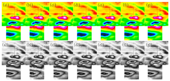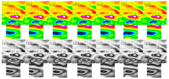 As can be seen from Figure 10, Figure 11, Figure 12 and Figure 13, the denoising effect of this paper’s algorithm is better than the rest of the algorithms in the measured magnetic anomaly benchmark map under different noise levels. After the denoising of this paper’s algorithm, the edge information of the benchmark map is better retained, and the edge information of the magnetic anomaly features is clearer, which can be observed intuitively in the advantages of this paper’s algorithm, both in the true-color and grayscale images. In Figure 10(g1,g2), Figure 11(g1,g2), Figure 12(g1,g2) and Figure 13(g1,g2), it can be seen that this paper’s algorithm basically does not lose the details of the reference image while removing the noise, and it has the highest retention, while the other methods lose a small amount of detail and appear distorted.