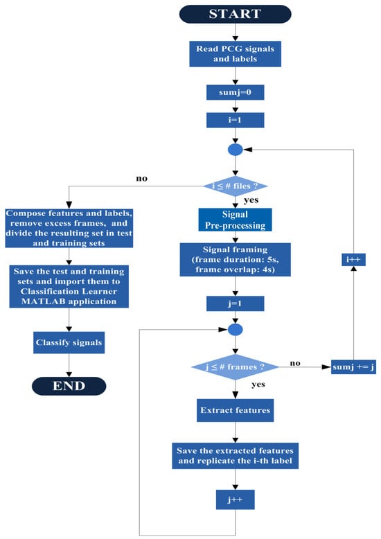 This work involves the training and the testing of different classifiers, namely SVMs, feed-forward NNs, and k-NN, to discern between normal and pathologic PCG signals (binary classification) and to detect various kinds of heart diseases, such as benign murmurs, coronary artery disease, or mitral valve prolapse (multiclass classification). MATLAB version 2021b (Mathworks Inc., Natick, MA, USA) was used to pre-process the PCG signals, extract features, and create the training and test datasets to be used in the Classification Learner application embedded in the MATLAB package for training and testing the different classifiers. Figure 1 depicts the high-level flowchart of the MATLAB code. The following steps are performed sequentially: