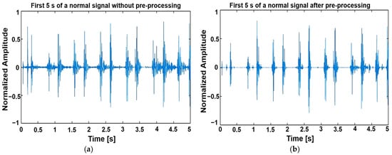 Figure 2 shows an example of the first 5 s of normal and pathologic PCG signals before and after the pre-processing.