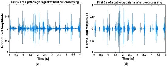 Normal and pathologic signals without and after pre-processing. (a) First 5 s of a normal signal without pre-processing. (b) First 5 s of a normal signal after pre-processing. (c,d): First 5 s of a pathologic signal without and after pre-processing.