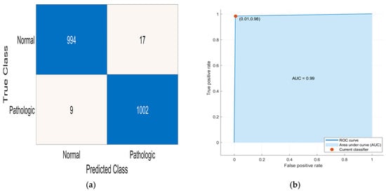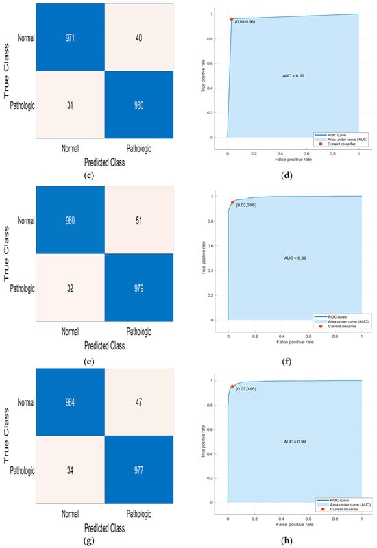 Table 4 shows the trained models that achieved the best performance on the test set for the binary classification (with “Normal” and “Pathologic” classes), highlighting the models’ parameters. A k-NN classifier (named k-NN1-B) outperforms all the other trained models, achieving a 98.7% accuracy. Following this, another k-NN classifier (named k-NN2-B) displays a slightly lower overall accuracy on the test set (96.5%). The third-best-performing trained model is a three-layer feed-forward NN (named NN1-B), which reached 96.0% accuracy. Another NN model (called NN2-B) yields a similar performance compared to the previous one (95.9% accuracy). Another k-NN classifier (named k-NN3-B) performs well on the test set, obtaining 95.5% accuracy, followed by a monolayer feed-forward NN (namely, NN3-B) (93.4% accuracy). Lastly, an SVM (“SVM1-B”) provides 93.3% accuracy. Furthermore, Table 4 reports the precision, sensitivity, specificity, F1-score, and BA of the best-performing models for binary classification; the obtained results are then discussed in Section 4.
