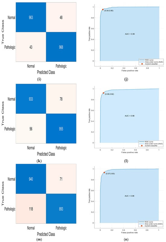 Confusion matrices and ROC curves for best-performing binary PCG classifiers: k-NN1-B (a,b), k-NN2-B (c,d), NN1-B (e,f), NN2-B (g,h), k-NN3-B (i,j), NN3-B (k,l), and SVM1-B (m,n); the color of each cell of the confusion matrices is representative of the relative numerical value reported; the different colors, associated with the numerical values from the smallest to the highest, can be set in MATLAB when the confusion matrices are printed (for example, from white to dark blue in this case).