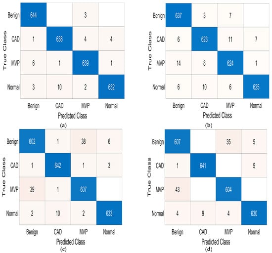 Traditional non-invasive diagnostic tools for cardiovascular diseases often involve expensive equipment and specialized medical personnel, limiting their use to specialized clinics and hospitals []. The phonocardiogram (PCG), in which the cardiac sound signals are used to analyze the heart’s health, offers an affordable alternative to the traditional non-invasive diagnostic tools. Various heart conditions, such as valvular heart disease, congenital heart disease, heart failure, high blood pressure, and coronary artery diseases (CAD), can be detected via the auscultation and interpretation of heart sounds []. The typical process of PCG signal classification involves denoising, segmentation, and classification. It is worth observing that PCG signals are susceptible to various noise sources, which can hamper proper signal segmentation and classification [,].