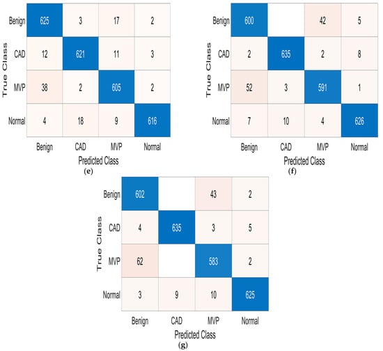Confusion matrices relative to the best-performing models on the test dataset for the multiclass case: k-NN1-M (a), k-NN2-M (b), NN1-M (c), NN2-M (d), k-NN3-M (e), NN3-M (f), and SVM1-M (g); the color of each cell of the confusion matrices is representative of the relative numerical value reported; the different colors, associated with the numerical values from the smallest to the highest, can be set in MATLAB when the confusion matrices are printed (for example, from white to dark blue in this case). Empty white cells in the confusion matrices mean a number of specific cases equal to zero.