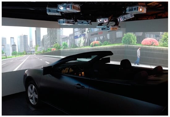 Data for this analysis were collected using a full vehicle driving simulator (Figure 1). The platform consists of an Oktal (Oktal Sydac, Toulouse, France) driving simulator, operating on SCANeR Studio v1.6 simulation software. To provide an immersive experience for participants, the driving environment was displayed using eight high fidelity projectors and 300° of wrap-around screens. The vehicle included a force-feedback enabled steering wheel and low frequency transducers installed under the driver’s seat.
