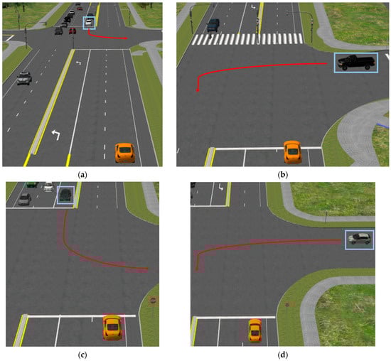 Left-turning vehicle hazards at intersections. Hazards are boxed in blue and participant drivers are in the orange vehicle. (a) Hazard vehicle turns from main road at signalized intersection; (b) hazard vehicle turns from minor road at half-signalized intersection; (c) hazard vehicle turns from major road at sign-controlled intersection; (d) hazard vehicle turns left from minor road at sign-controlled intersection.