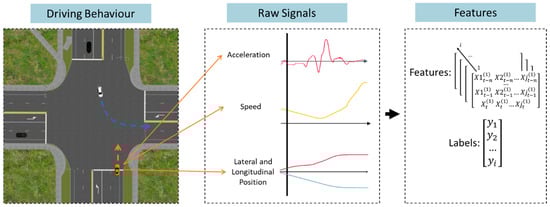 Modelling the behaviour of other road users starts with perception. The perception stack of an AV includes multiple sensors, particularly a variety of cameras, in addition to Light Detection and Ranging (LiDAR) and RADAR systems [15,16]. Data collected by these sensors are fused and transformed to generate a real-time understanding of the AV’s environment, including the relative and absolute location, speed, and acceleration of other road users [16,17]. It follows that these variables represent the minimum amount of information available to an interacting AV. However, a proposed US mandate may soon make vehicle-to-vehicle (V2V) connectivity standard in all lightweight vehicles, including passenger cars [18], and Transport Canada has also established a plan to “coordinate and collaborate” with the US Department of Transportation to deploy V2V technology [19]. This advancement would dramatically increase the type of data available for use in behaviour prediction including information about the steering inputs, braking, and accelerator pedal status of other vehicles [20]. Therefore, in this study, behaviour of human-operated vehicles at intersections is predicted both with and without V2V data to compare the value added by the additional information to the task of predicting behaviour at intersections.