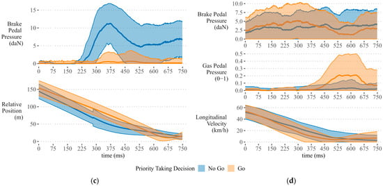Plots of selected features for each control type/dataset combination averaged across participants and separated by priority-taking decision. Shaded regions represent the standard deviation around the mean: (a) Selected features from the signalized intersection data; (b) selected features from the stop-sign-controlled data; (c) selected features from the signalized intersection data including the V2V variables; (d) selected features from the stop-sign-controlled data including the V2V variables.