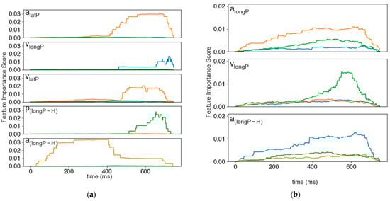 For the signalized, sensor-only dataset, all but one of the selected features demonstrated a peak in feature importance scores between 0.5–2.5 s prior to stop bar incursion (Figure 6a). The remaining feature, the relative longitudinal acceleration () peaked much earlier in the 3–5.5 s prior to stop bar incursion. This feature also had the highest feature importance values of all the selected features. Similarly, the mean of the brake pedal pressure feature from the V2V inclusive dataset reached its maximum feature importance scores starting about 5.25 s prior to stop bar incursion (Figure 6c). In other words, both signalized datasets had at least one feature that demonstrated a high feature importance score early in the time series. It follows that the advantage of including the V2V data is that fewer features are required to achieve slightly greater accuracy and still provide an early indicator of future priority-taking behaviour.