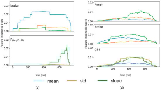 Temporal importance curves for mean, standard deviation (std), and slope of selected features. Calculated using entropy gain. (a) Signalized intersection dataset, which included participant lateral acceleration (, participant longitudinal velocity (), relative longitudinal acceleration difference between the participant and hazard (), participant lateral velocity (), and relative difference in longitudinal position between the participant and hazard (); (b) stop-sign-controlled dataset, which included participant longitudinal acceleration (, participant longitudinal velocity (), relative longitudinal acceleration difference between the participant and hazard (); (c) signalized intersection dataset when the V2V variables were included. This included participant brake pedal pressure ( and relative difference in longitudinal position between the participant and hazard (); (d) stop-sign-controlled dataset when the V2V variables were included. These features were participant longitudinal velocity (), participant brake pedal pressure (), and participant gas pedal pressure ().