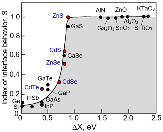 Influence of electronegativity on the value of S in φBn = S(ΔX) dependence, where φBn (eV) is the height of the Schottky barrier, and ΔX (eV) is the difference in electronegativity (X) of the metal and semiconductor. Adapted with permission from [23]. Copyright 1969 American Physical Society.