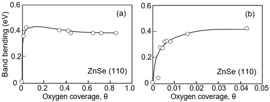 Changes in band bending ΔqV as a function of oxygen coverage for ZnSe(110); (a) in the region up to 0.83 monolayer oxygen and (b) in the region of small coverages where the changes are large. Data extracted from [25].