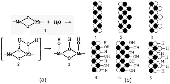(a) Schematic diagram illustrating water adsorption on the surface of metal oxides: At the first stage of adsorption, a water molecule will be physically adsorbed on an activated site (1) to form an adsorption complex (2), which will subsequently transfer to surface hydroxyl groups (3). Adapted with permission from [35]. Copyright 1969: ACS. (b) Schematic illustration of the surface stoichiometry and hydration of II–VI semiconductor: 1—Non-hydrated stoichiometric II–VI surface; 2—Non-hydrated zinc (cadmium)-rich II–VI surface; 3—Non-hydrated sulfur (selenium, tellurium)-rich II–VI surface; 4—Hydrated stoichiometric II–VI surface, 5—Hydrated zinc (Cd)-rich II–VI surface; 6—Hydrated sulfur (Se, Te)-rich II–VI surface. Reprinted from [34]. Published 2011 by BMC as open access.