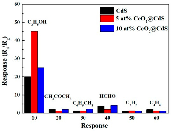 Figure 5. Selectivity of the sensors to 100 ppm ethanol (C2H5OH), acetone (CH3COCH3), toluene (C6H5CH3), formaldehyde (HCHO), ethyne (C2H2), and tetrahedrane (C4H4). Reprinted from [50]. Published 2017 by MDPI as open access. - Secondly, it was found that the gas-sensitive mechanism [16,17,19] and all the regularities established for metal oxides [59] also work in gas sensors based on II–VI compounds [39,43,60]. This means that (i) for better sensitivity, films based on II–VI semiconductors should be porous with small grain size and a high specific surface area [61], (ii) reducing the film thickness and increasing the pore size helps reduce response and recovery time [62,63], and (iii) increasing operating temperature reduces response and recovery time [62]. As for the effect of film thickness on the sensory response, it depends on the type of semiconductor, film structure, and the gas being detected. For example, studies of CdSe and CdS films have demonstrated an increase in sensitivity to oxygen and carbon monoxide as the film thickness of these materials increases [62,63,64]. At the same time, Dzhurkov et al. [65] reported that their thermal sputtered ZnSe sensors showed a decrease in sensitivity to ethanol as the thickness increased from 50 to 160 nm. It was also found that the gas sensitivity of II–VI semiconductors showed a dependence of the gas sensor response on the crystal shape [58], as was previously found for metal oxides [66].