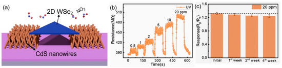 (a) Scheme of the CdS-WSe2 heterojunction-based sensor exposed to NO2. To fabricate the hybrid junction device, the WSe2 nanosheets were transferred to the patterned CdS nanowires arrays by the wet transfer method. (b) Dynamic sensing performance to various NO2 concentrations under UV illumination. (c) Long-term stability of the gas sensor to 20 ppm NO2. Dashed line corresponds to the initial value of the sensory response. Reprinted from [83]. Published 2024 in ChemRxiv as open access.
