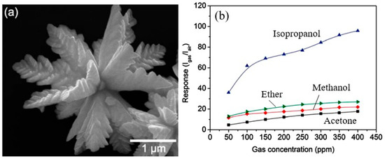 (a) Field emission SEM image of a leaf-like CdS micro-/nanostructure prepared by the hydrothermal method at 150 °C; and (b) calibration curves of CdS sensing responses vs. VOCs. The sensory response is calculated as Igas/Iair, where Iair is the current through the sensor, measured in the atmosphere, and Igas is the current through the sensor measured at the same voltage in the test gas atmosphere. Reproduced with permission from [57]. Copyright 2012: Royal Society of Chemistry.