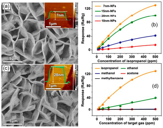 (a,c) SEM image of CdS nanoflakes (NFs) with different flake thickness: (a) 7 nm; (c) 28 nm (inset is an atomic force microscopy image of a nanoflake thickness). (b,d) Influence of the concentration of organic solvent vapors on the response of CdS NF-based sensors, fabricated on interdigitated electrode. Reproduced with permission from Liu et al. [58]. Copyright 2017: ACS Publications.