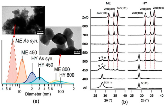 (a) Log-normal approximate numerical distribution of ZnS nanoparticle diameter obtained from TEM images. The inserts in the figure are SEM images of ZnS powders after appropriate treatments. (b) Evolution of the XRD diffractograms at different calcination temperatures. The S(111) index is referred to as sphalerite-phase ZnS. The dotted lines emphasize the presence of the three main reflections of ZnO. Markers show the presence of the wurtzitic ZnS reflections: (▼) = (100), (○) = (100), and (▽) = (100). AS = as-synthesized. Temperatures are indicated in Celsius degrees. ME—miniemulsion; HY—hydrothermal synthesis. Reprinted with permission from [122]. Copyright 2018: ACS.