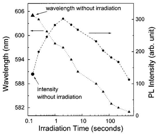 Intensity and peak wavelength position of the PL spectra vs. the photoirradiation time for the CdSe QDs. Reprinted with permission from [149]. Copyright 2003: AIP Publishing.