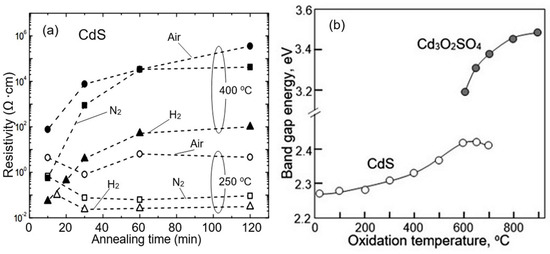 (a) The rate of phase conversion of ZnSe, CdSe, and CdS into the oxide phase with temperature. The phase percentage indicates the percentage of II–VI semiconductors and their oxide phase in the heat-treated material. Data extracted from [138]. (b) Intergrain barrier measurements for CdS thick film subjected to thermal treatment in a synthetic air atmosphere. All measurements were carried out in a chamber at 25 °C. Reprinted from [40]. Published 2016 by MDPI as open access.
