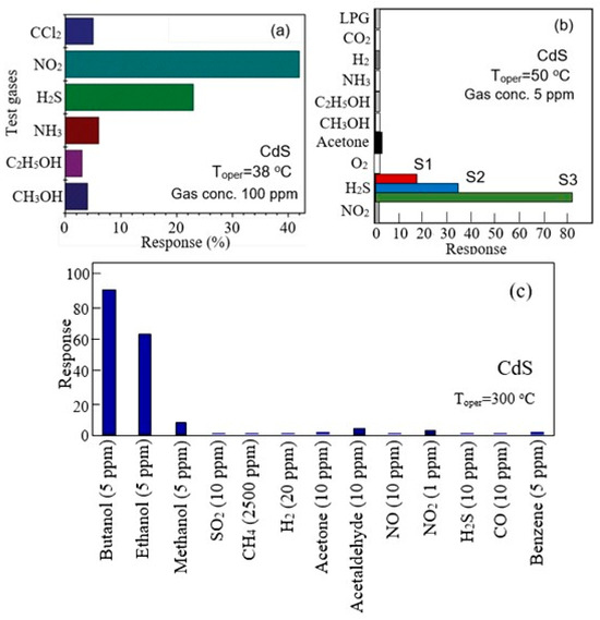 - First, gas sensors based on II–VI semiconductors are sensitive to toxic and flammable gases and vapors. There are currently reports of the development of II–VI compound-based gas sensors capable of detecting O2, O3, SO2, H2, H2S, NH3, NO2, Cl2, CCl4, CO2, ethanol, methanol, acetone, benzene, formaldehyde, isopropanol, gasoline, toluene, and liquefied petroleum gas (LPG) [37,41,50]. Moreover, these sensors demonstrated sensitivity to these gases, acceptable for real use. As a rule, among the most dangerous gases, in most cases, the sensors had a maximum response to H2S [51,52] or NO2 [53,54], and among organic solvents, sensitivity decreased when moving from ethanol to methanol and acetone (formaldehyde, benzene, toluene, and acetylene) [39,50,55]. One example illustrating this behavior of sensors is shown in Figure 5. Of course, sensors developed in different laboratories could demonstrate completely different characteristics. For example, ZnS sensors developed by Shinde et al. [56], among toxic gases, had the maximum sensitivity to Cl2, and in the CdS sensors developed by Fu et al. [57] and Liu et al. [58] among organic solvents, isopropanol had the highest sensitivity.