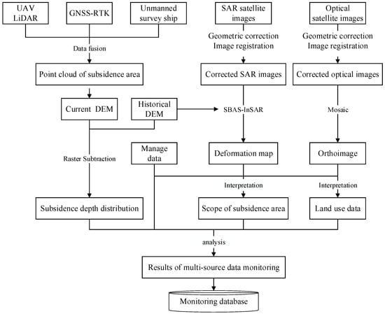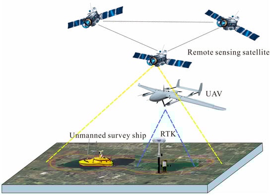 The space–air–ground collaborative observations of coal mining subsidence areas mainly contain satellite remote sensing, UAV LiDAR, unmanned survey ship, and GNSS-RTK technology (Figure 1), which can comprehensively monitor and grasp the area changes, land use changes, and governance status in coal mining subsidence areas.