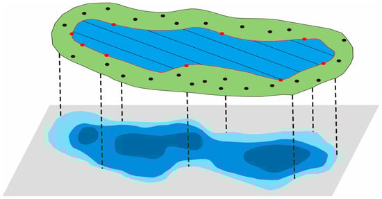 The topography of the coal mining subsidence area is mainly obtained through three methods: UAV LiDAR, unmanned survey ships, and GNSS-RTK. First, low-altitude drones are used to obtain point cloud data outside the water area, and then unmanned ships are used to obtain underwater measurement point cloud data within the water area. Finally, GNSS-RTK is used to supplement some measurement points at the junction of land and water and the DEM accuracy check points generated after the final point cloud was fused (Figure 6).