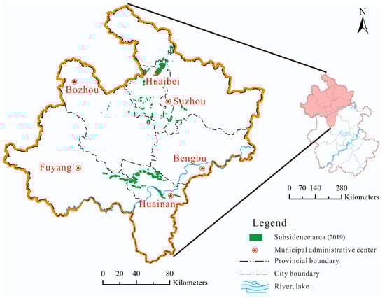 The subsidence area is distributed in the Huainan mining area and the Huaibei mining area, covering 19 counties in six cities in northern Anhui (total area 22,569 km2), and belongs to the Huaibei Plain, Jianghuai Plain, and Huanghuaihai Economic Zone. The northern Anhui area is rich in groundwater. Due to different structural conditions, the water level gradually increases from south to north. It is a typical high water level mining area [36]. The landforms of the six cities in northern Anhui are mainly plains, with high levels in the west and low levels in the east. As of the end of 2022, the total coal reserves in the coal mining subsidence area of northern Anhui were 34.287 billion tons, making an important contribution to support the economic and social development of the Anhui province and even the Yangtze River Delta region, and effectively ensuring national energy security. With the large-scale mining in the Lianghuai mining areas (Huainan and Huaibei mining areas), large-scale surface subsidence has occurred, which has a great impact on the ecological environment and human life [37]. As of 2022, there are 121 coal mining subsidence areas with an area of 751 km2, and Huainan and Huaibei cities account for 76% of the coal mining subsidence areas (Figure 7).