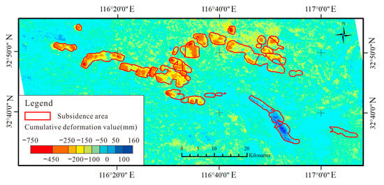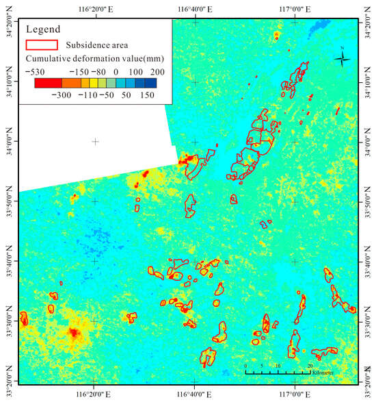 Figure 8. Cumulative deformation value of subsidence areas (Huaibei mining area).