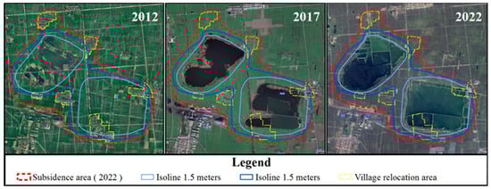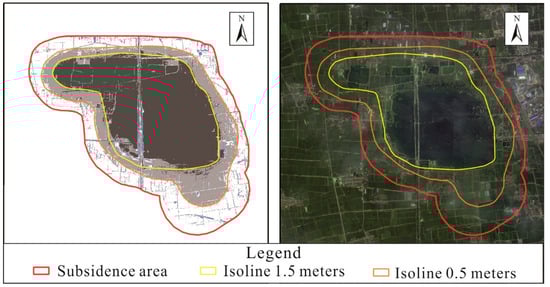 After subtracting the two DEMs, the software ArcGIS 10.2 was used to classify them into 500 mm and 1500 mm, and superimpose the 2022 remote sensing orthophotos. The isoline data were extracted through human–computer interaction to obtain the range of different subsidence depths (Figure 10).