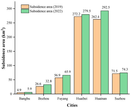 Based on the basic situation survey of coal mining subsidence areas in Anhui Province in 2019, as of the end of 2022, there were 121 coal mining subsidence areas in six cities in northern Anhui, of which 16 were new, with a total area of 750.9 km2. From Figure 7, the total area of coal mining subsidence areas were increased by 8.1% when compared to 2019. The coal mining subsidence areas in descending order of area are as follows: Huainan, 292.5 km2 (39.0%), an increase of 11.5%; Huaibei, 279.54 km2 (37.2%), an increase of 2.7%; Suzhou, 74.3 km2 (9.9%), an increase of 3.9%; Fuyang, 65.9 km2 (8.8%), an increase of 15.8%; Bozhou, 32.8 km2 (4.4%), an increase of 23.3%; Bengbu, 5.9 km2 (0.7%), an increase of 20.4%.