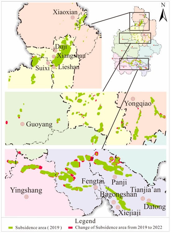 From Figure 11 and Figure 12, the distribution of coal mining subsidence areas in 2022 is similar to that in 2019. It is mainly concentrated in the northern part of Huainan and the entirety of Huaibei, covering an area of 572.0 km2, accounting for approximately 76.2% of the total area of coal mining subsidence areas. Coal mining subsidence areas can be divided into the Huaibei mining area and the Huainan mining area, according to location distribution. The Huaibei mining area is mainly concentrated in Duji, Lieshan, Xiangshan, Suixi, Yongqiao, and Guoyang. The Huainan mining area is mainly concentrated in Fengtai, Panji, Bagongshan, and Yingshang. Since the recorded coal mining subsidence areas in 2019, Lixin and Bozhou have been added. Judging from the location of the increased subsidence areas, the subsidence range in the Huainan mining area has increased significantly, while that in the Huaibei mining area is relatively small.