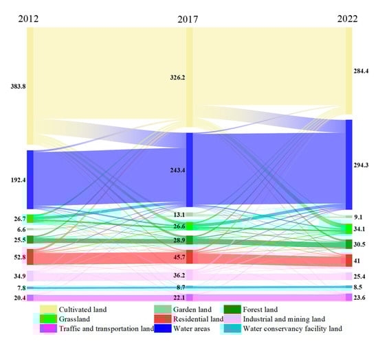 - From 2012 to 2022, the land area decreases from large to small are as follows: cultivated land, residential land, and industrial and mining land. The increases in area of land types from large to small are as follows: water areas, grassland, forest land, traffic and transportation land, garden land, and water conservancy facility land.