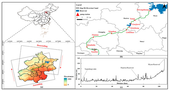 Overview of the research area. (a) Location and SAR images coverage range. The arrow points in the direction of satellite flight. (b) The route of Jing-Mi Diversion Canal. (c) The elevation distribution along the route.