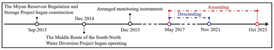 Sentinel-1 consists of two polar orbiting satellites, Sentinel-1A and Sentinel-1B. They operate alternately day and night. The satellite performs C-band synthetic aperture radar imaging. The collection interval for SAR images is mostly 12 days. Sentinel-1 requires an uplink track to cover the entire JMDC route. Single look complex (SLC) data obtained by Sentinel-1 in interferometric wide swath mode were used to monitor the diversion canal at a resolution of 5 m × 20 m (range × azimuth). In this study, we used 187 ascending SAR images from 20 May 2017, to 4 October 2023 to calculate the LOS deformation along the JMDC, with an azimuth angle of 347° and an incidence angle of 42°. One hundred two descending SAR images from 7 May 2017 to 30 November 2021 were used for auxiliary analysis, with an azimuth angle of 194° and an incidence angle of 37°. Then, leveling measurements were used to verify the accuracy of the subsidence values. The date and timeline of SAR images acquisition are shown in Figure 2.