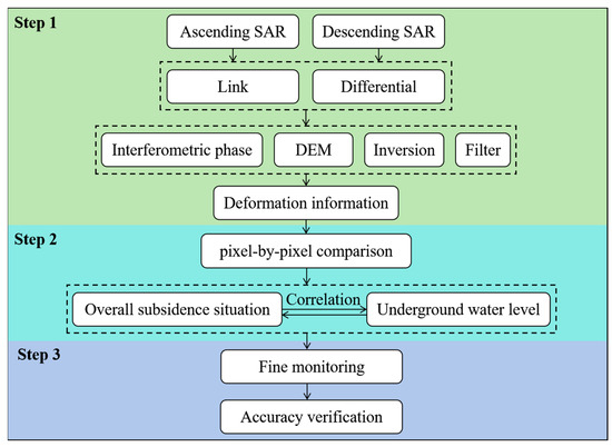The combination detection of PSs and DSs may improve the accuracy of subsidence monitoring, but this depends on the PS points. In addition, PS-InSAR has requirements on the number of images that are too strict [29,30], meaning that the existing number of descending images is sometimes unable to meet its requirements. SBAS-InSAR can obtain more interferometric pairs with shorter temporal and spatial baselines than PS-InSAR by increasing the time sampling through small baseline combinations. To ensure that we could obtain satisfactory results, we decided to use SBAS-InSAR for the calculation and validate it with leveling results. We designed a deformation monitoring process for the diversion canal. It is divided into three modules in total, and the flow chart is shown in Figure 3.
