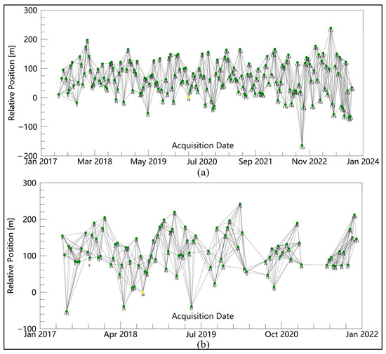 The temporal and spatial baseline of SAR images. (a) Ascending and (b) descending data. Yellow dots represent the master image, green dots represent the slave image.