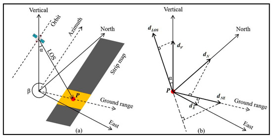 Three-dimensional decomposition of deformation. (a) SAR system relative to geographic coordinate system. (b) Decomposition of P-point deformation.