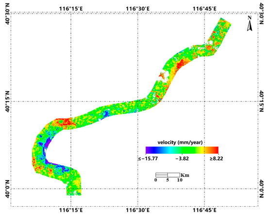 The second step is to investigate the deformation situation along the entire diversion canal, identify unstable areas, and explore the impact of groundwater level on subsidence. Affected by groundwater exploitation, the surface deformation in Beijing is dominated by subsidence [32,33,34]. Due to the sensitivity of InSAR to vertical deformation when compared with horizontal deformation, it is usually assumed that horizontal deformation can be ignored when investigating large-scale deformation [35,36,37]. In view of the above, to quickly investigate the overall situation on a large scale, we project the calculated LOS deformation into the vertical direction as the subsidence, which can be expressed as follows: