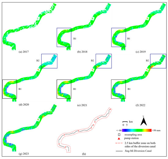 (a–g) Accumulated subsidence from 2017 to 2023. (h) The coverage diagram of buffer zone.