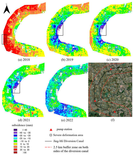 (a–e) Subsidence of resampled area B1 obtained by ascending SAR images. (f) The ESRI satellite imagery along the canal from Tundian to Niantou.
